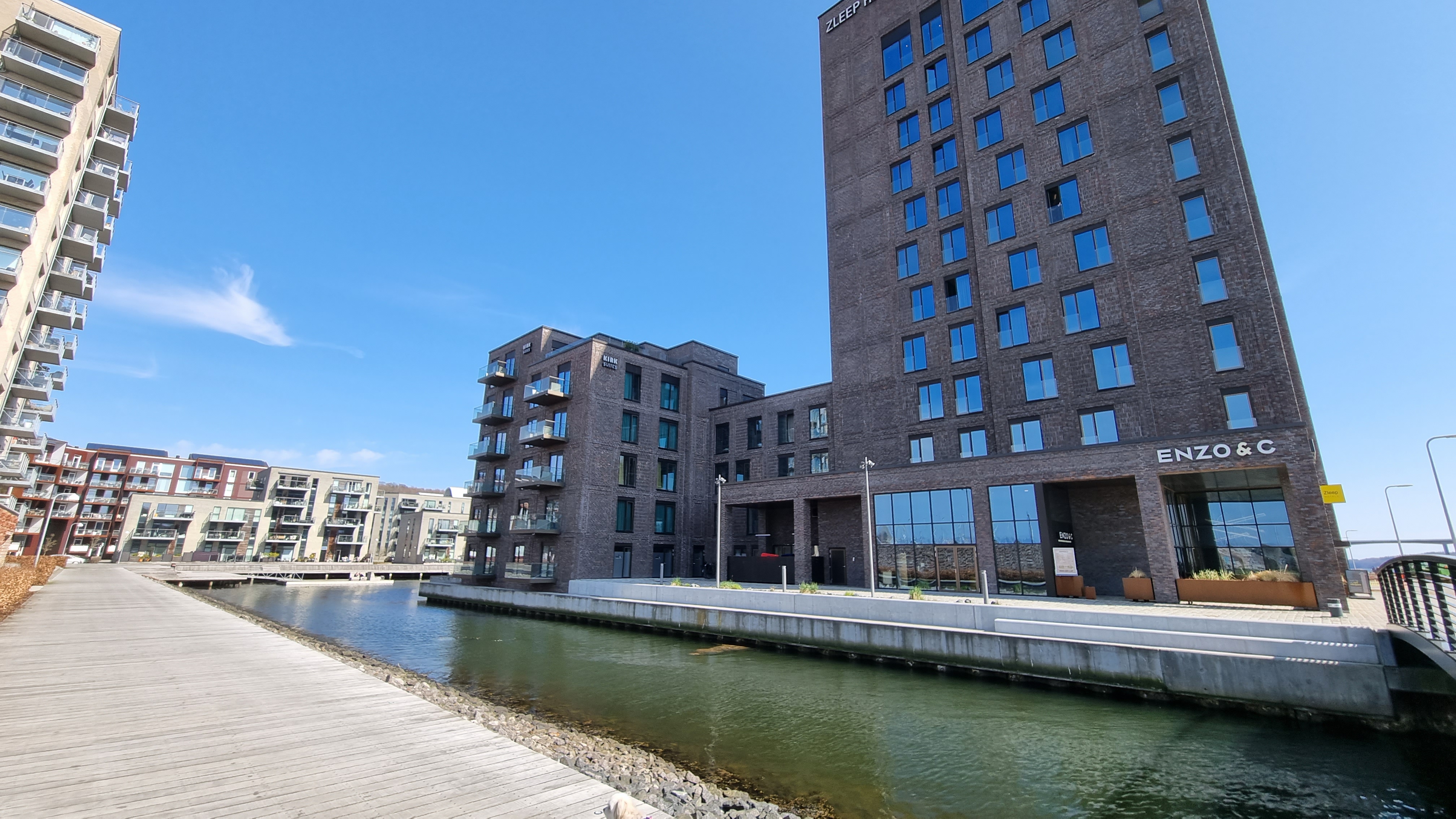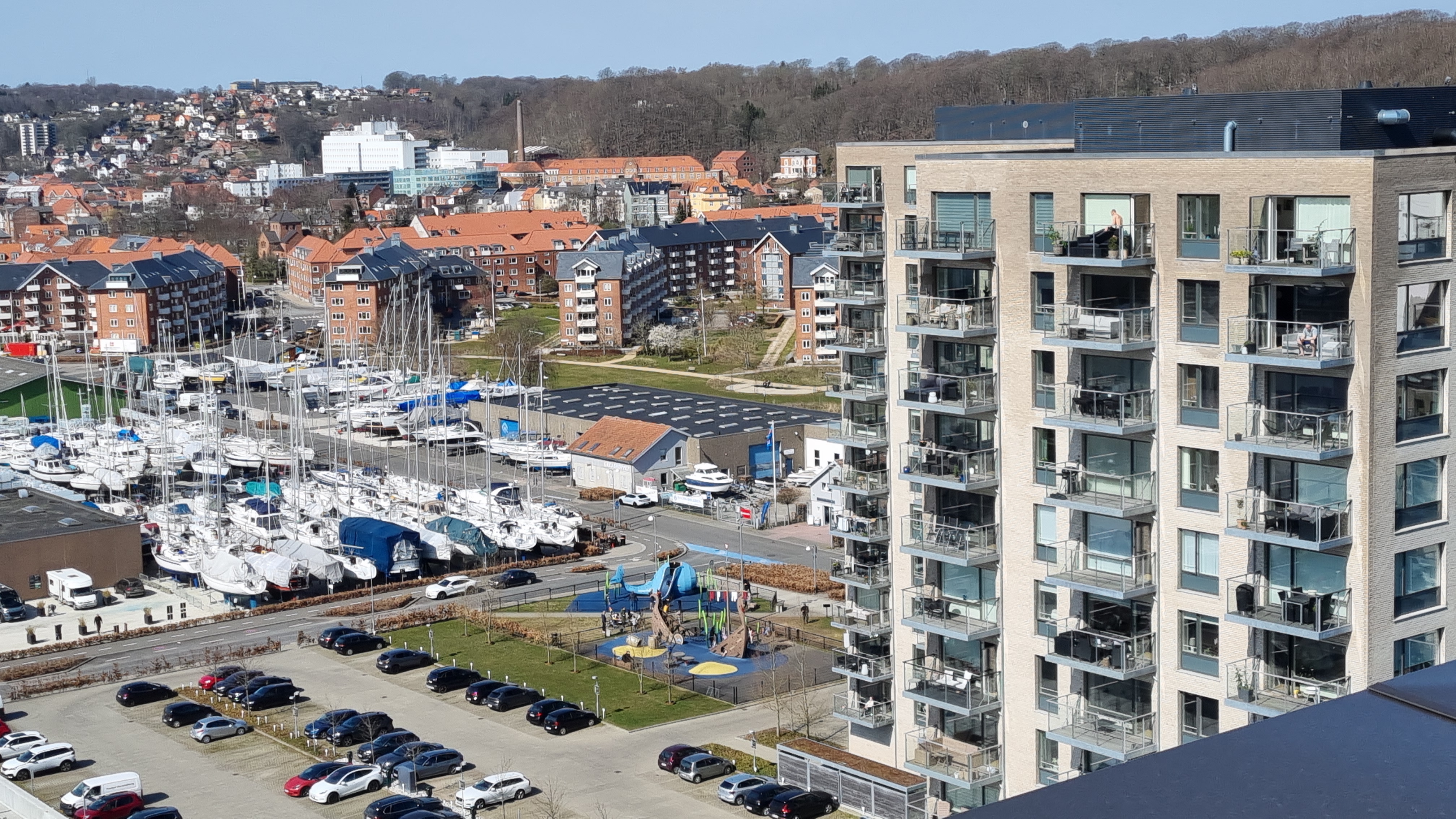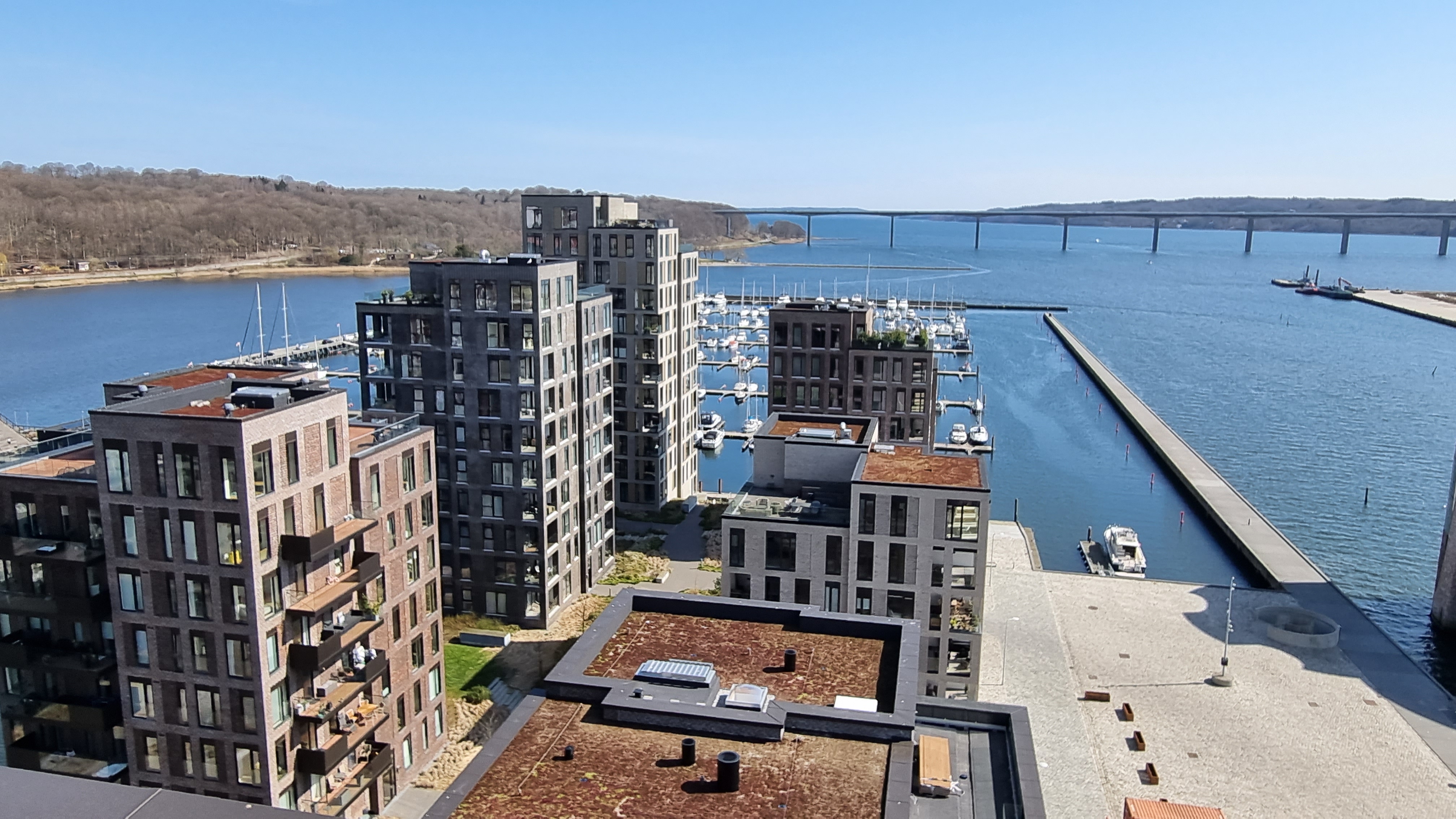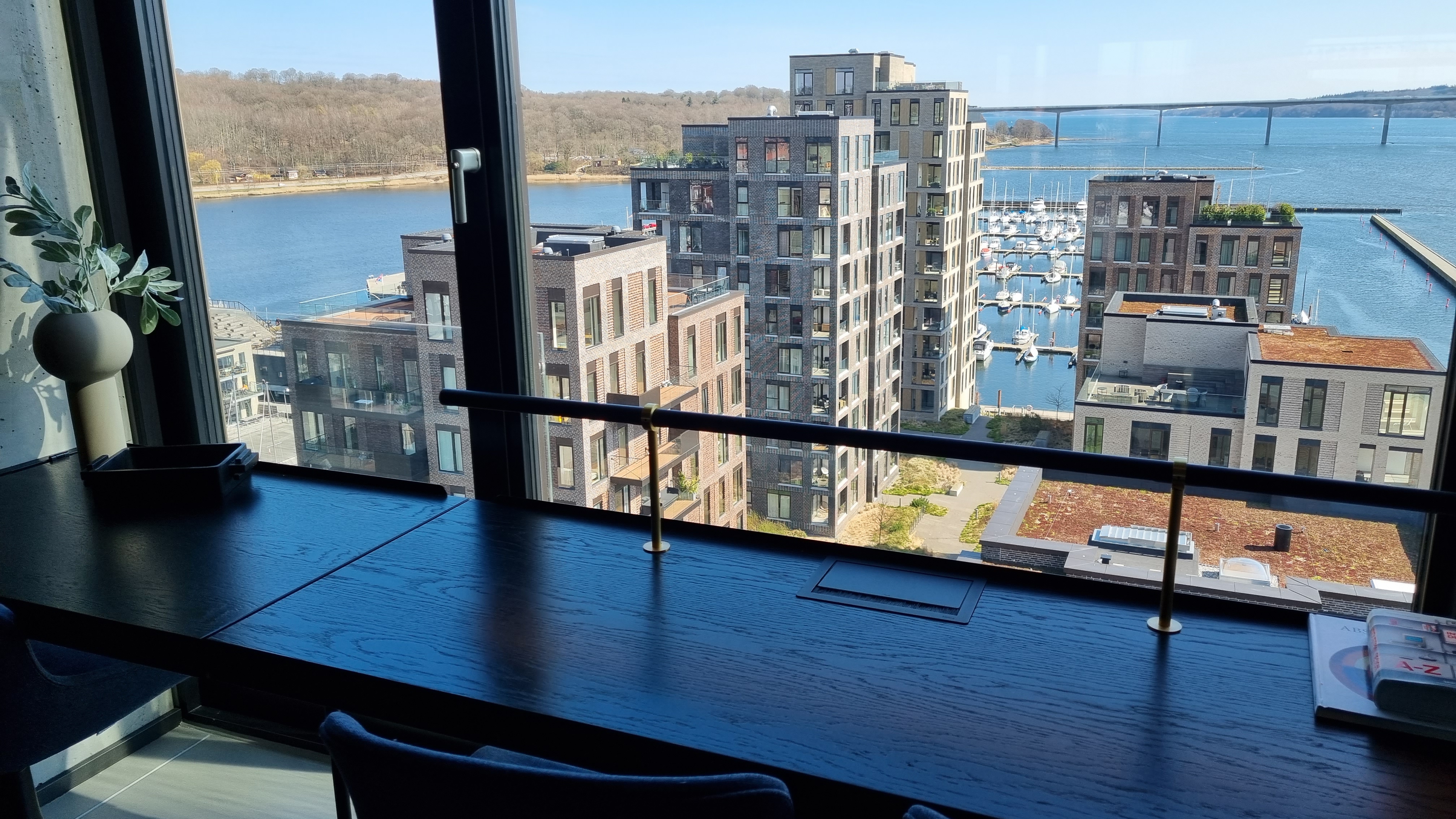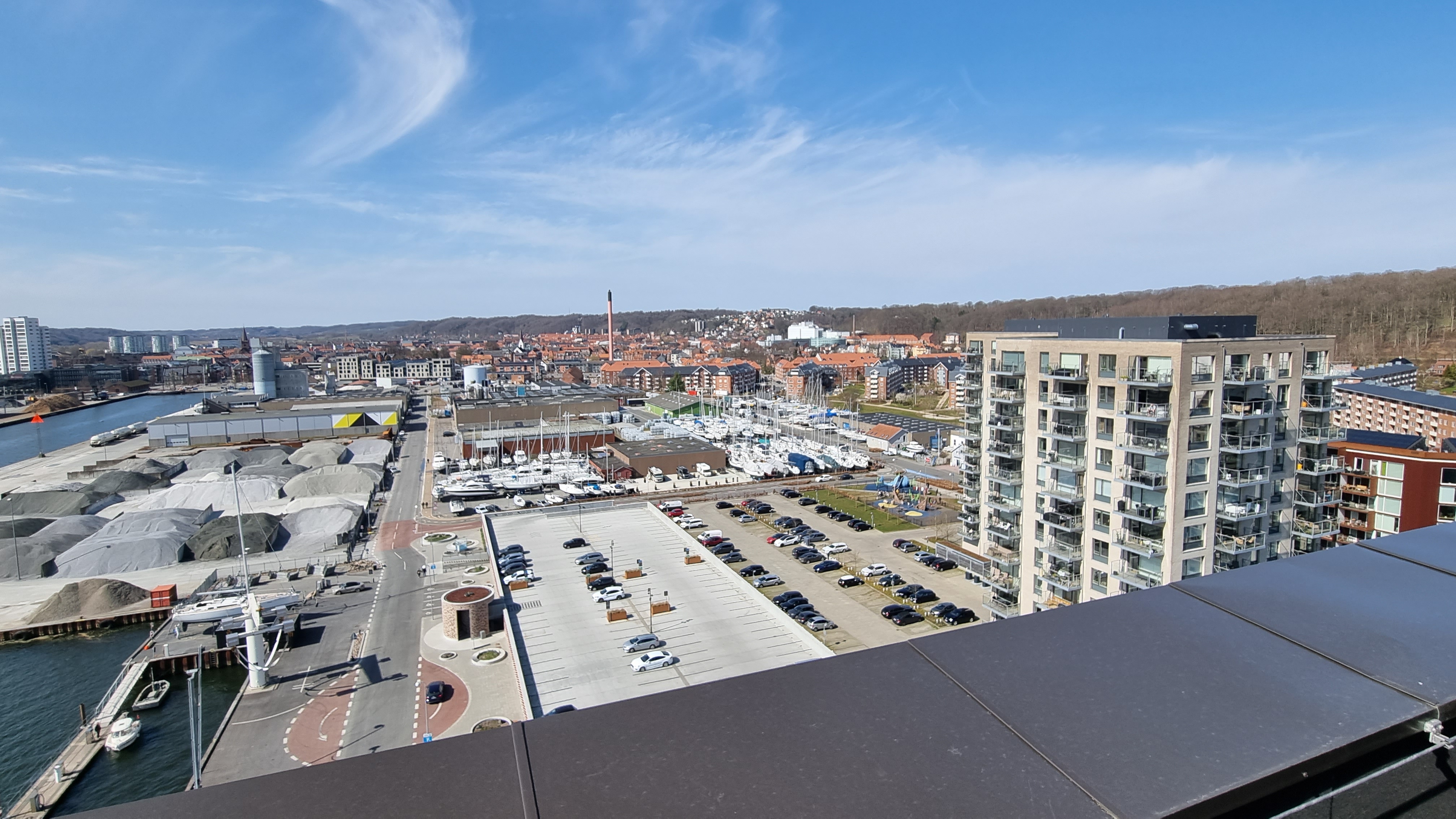 Højhuset Zleep hotel med udsigt fra 11 etage, og Fjordenhus.